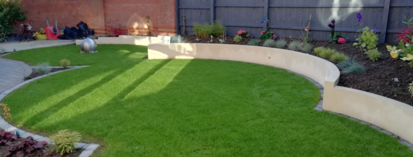 The design of this garden needed to address the slope upwards towards the back fence and distract from the view of the neighbouring house. The raised curved border (expertly crafted by the clients themselves!) allowed the series of circular lawns to be levelled while drawing the eye around the garden. The fence colour chosen to blend in with the tiles of the roof behind. The planting will mature to soften the edges and provide texture and height.